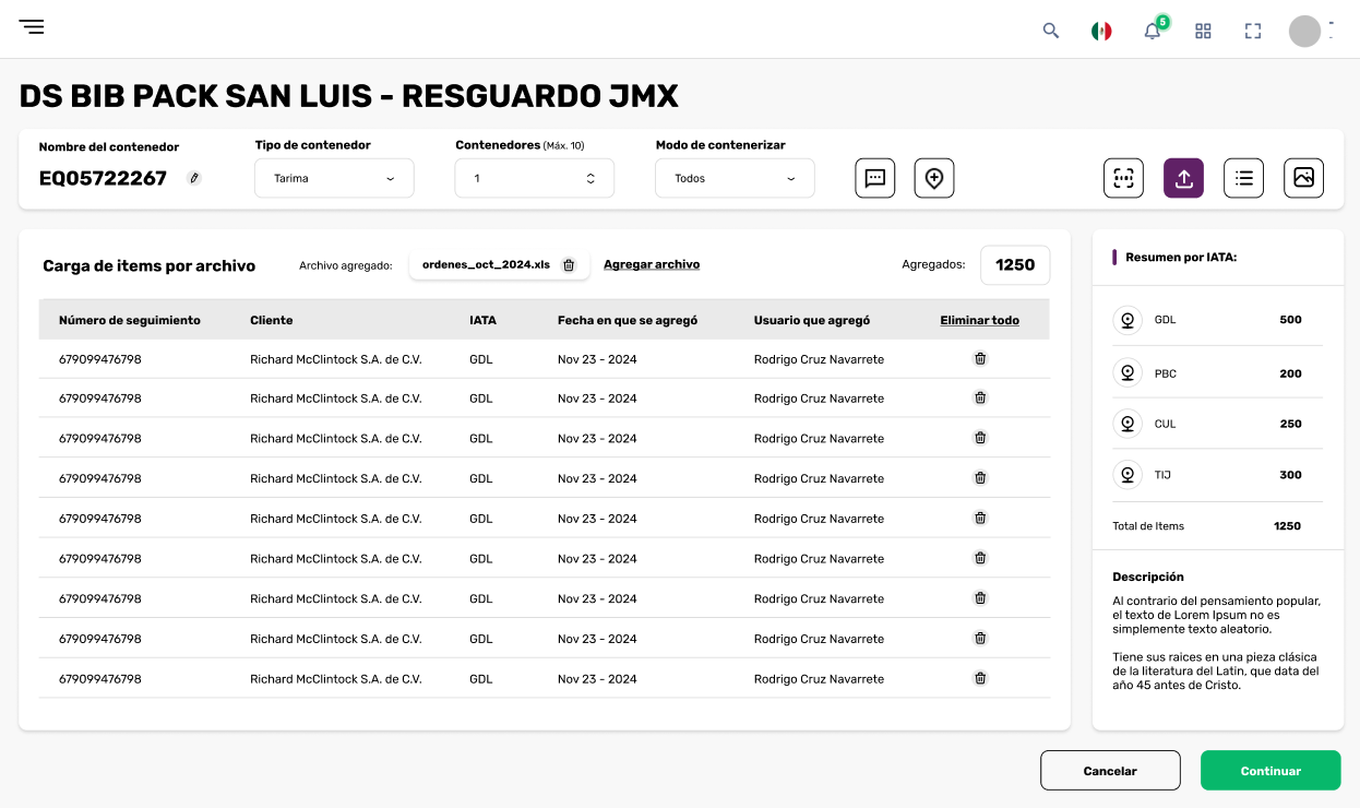 En este apartado el usuario podrá generar contenedores que sirven para agrupar múltiples guías en un master (contenedor) y definir su destino.