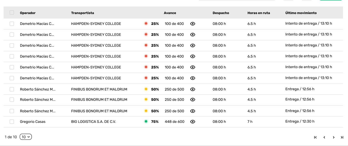Debajo se mostrarán las opciones para buscar y filtrar. Así como la opción de organizar de mayor a menor y viceversa, acorde al % de avance de la ruta.